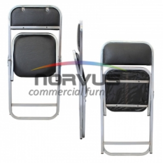 Silla con asiento y respaldo acojinado y estructura en tubular plegable, diseñadas para el uso del alquiler.