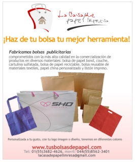Fabricamos bolsas publicitarias en papel y otros materiales, tenemos los mejores precios y calidad para que su productos o servicio se promocione eficazmente, una bolsa es la mejor manera de tener presente su marca en la mente del consumidor, además de un medio muy eficaz de publicitarse.